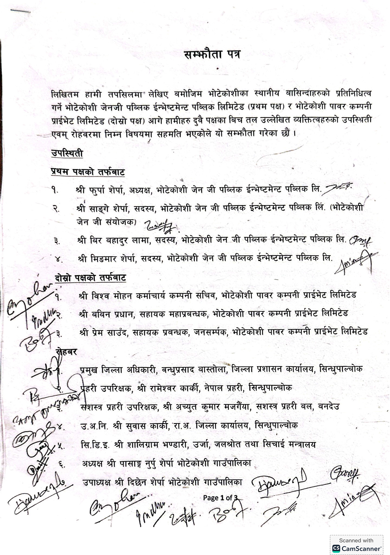 सम्झौतामा भोटेकोशी जेनजी पब्लिक इन्भेष्टमेन्टका अध्यक्ष फुर्पा शेर्पा र भोटेकोशी पावर कम्पनीका सचिव विश्वमोहन कर्माचार्य लगायतका प्रतिनिधिहरूले हस्ताक्षर गरेका छन् ।