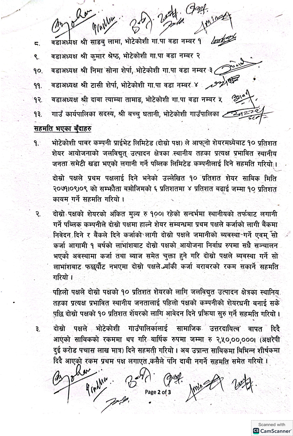 सम्झौतापत्रमा उल्लेख छ, ‘भोटेकोशी पावर कम्पनी प्रालि (दोस्रो पक्ष) ले आफ्नो शेयरमध्येबाट १० प्रतिशत शेयर आयोजनाको जलविद्युत् उत्पादन क्षेत्रका प्रत्यक्ष प्रभावित स्थानीय जनतालाई समेटी खडा भएको पब्लिक लिमिटेड कम्पनीलाई दिने सहमति गरियो।’